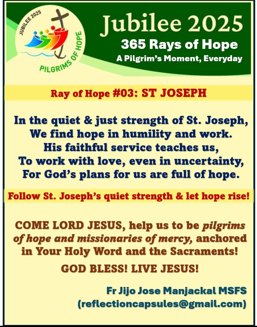 Rays of Hope - Jubilee 2025 stickers Rays of Hope #03 Saint Joseph January 5, 2025 Fr Jijo Manjackal MSFSLeave a comment Download here – #03 St JosephDownload Share this: Click to share on X (Opens in new window) X Click to share on Facebook (Opens in new window) Facebook Like Loading...