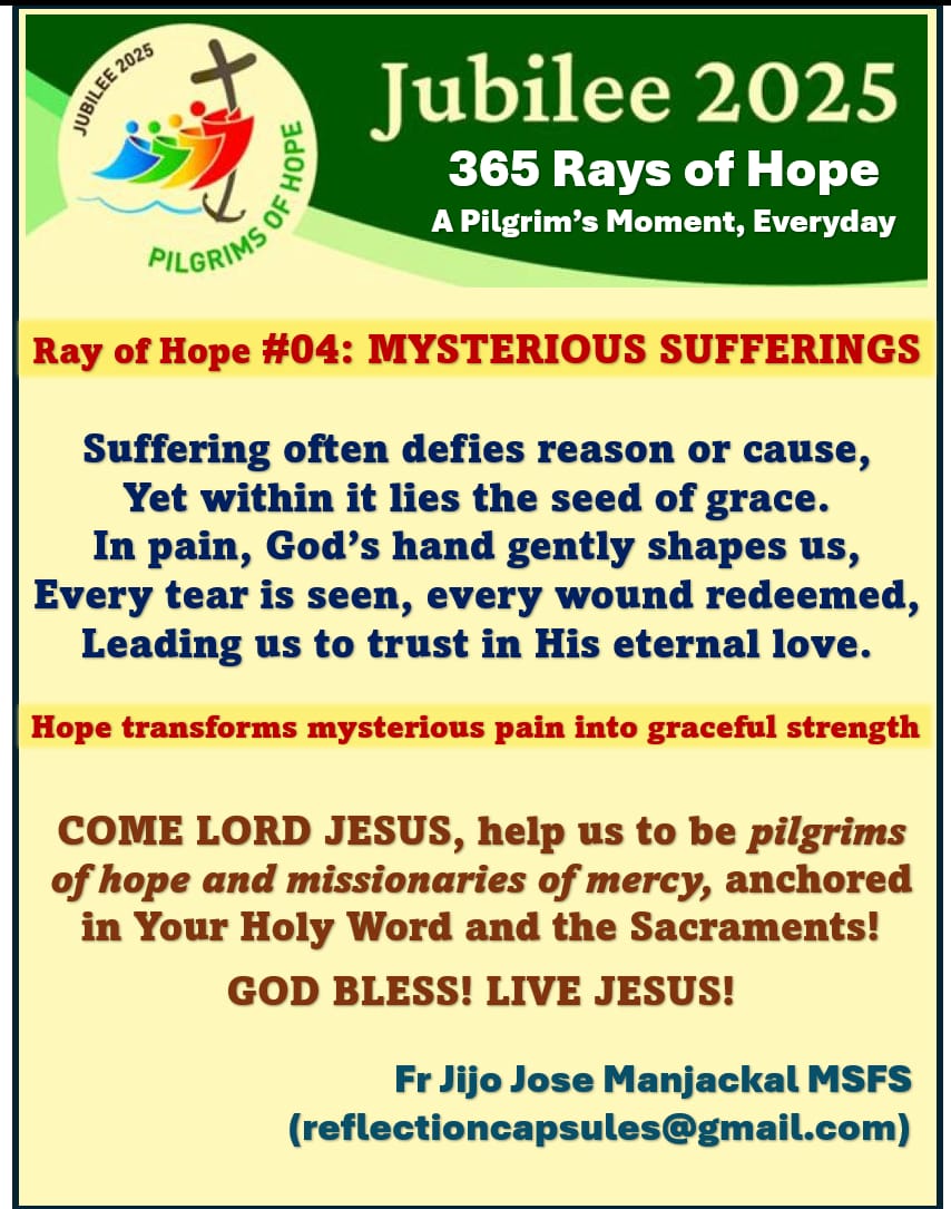 Rays of Hope - Jubilee 2025 stickers Rays of Hope #04 Mysterious Sufferings January 5, 2025 Fr Jijo Manjackal MSFSLeave a comment #04 Mysterious SufferingsDownload Share this: Click to share on X (Opens in new window) X Click to share on Facebook (Opens in new window) Facebook Like Loading...