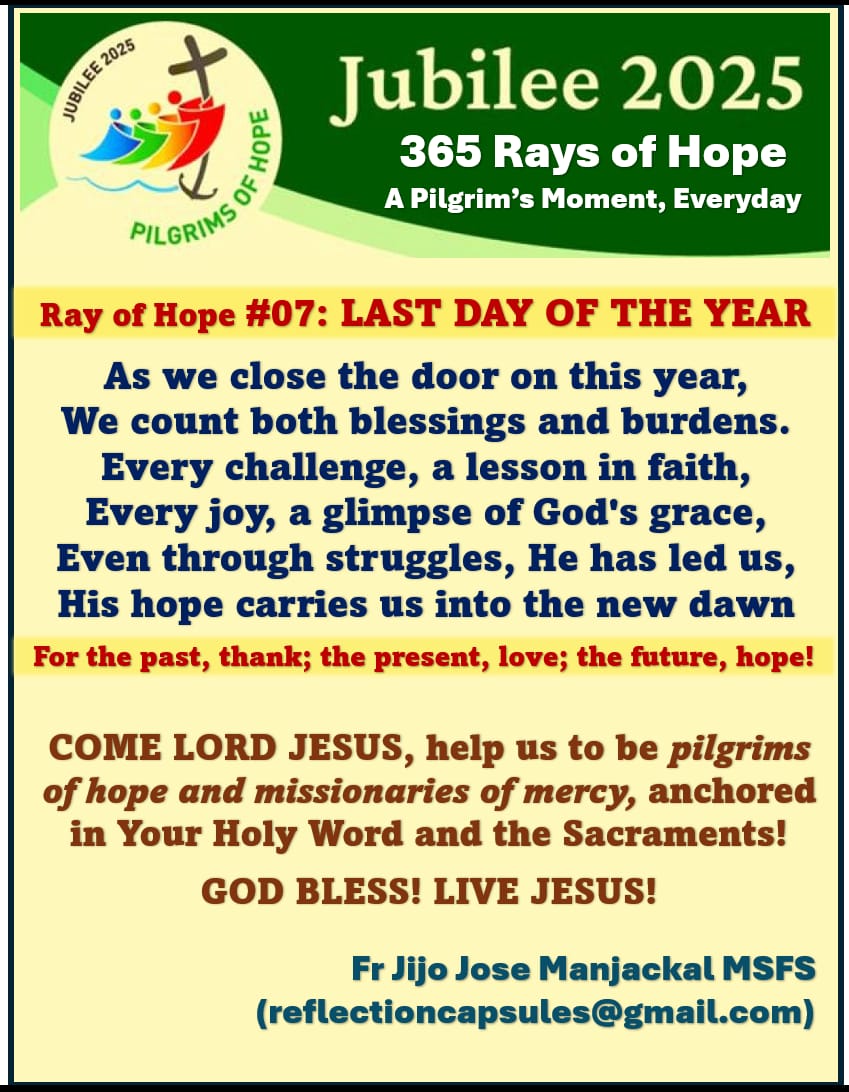 Rays of Hope - Jubilee 2025 stickers Rays of Hope #07 Last day of the Year January 5, 2025 Fr Jijo Manjackal MSFSLeave a comment #07 Last Day of the YearDownload Share this: Click to share on X (Opens in new window) X Click to share on Facebook (Opens in new window) Facebook Like Loading...