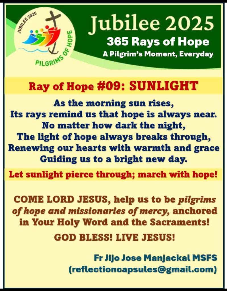 Rays of Hope - Jubilee 2025 stickers Rays of Hope #09 Sunlight January 5, 2025 Fr Jijo Manjackal MSFSLeave a comment #09 SunlightDownload Share this: Click to share on X (Opens in new window) X Click to share on Facebook (Opens in new window) Facebook Like Loading...