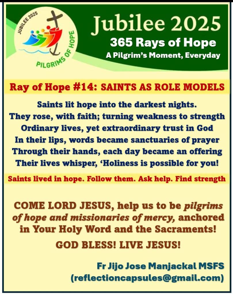 Rays of Hope - Jubilee 2025 stickers Rays of Hope #14 Saints as Role Models January 7, 2025 Fr Jijo Manjackal MSFSLeave a comment #14 Saints as Role ModelsDownload Share this: Click to share on X (Opens in new window) X Click to share on Facebook (Opens in new window) Facebook Like Loading...