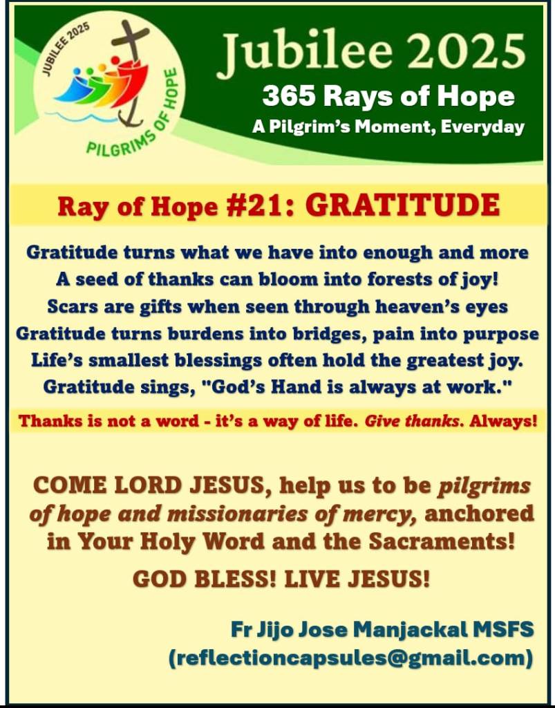 Rays of Hope - Jubilee 2025 stickers Rays of Hope #21 Gratitude January 10, 2025 Fr Jijo Manjackal MSFSLeave a comment #21 GratitudeDownload Share this: Click to share on X (Opens in new window) X Click to share on Facebook (Opens in new window) Facebook Like Loading...