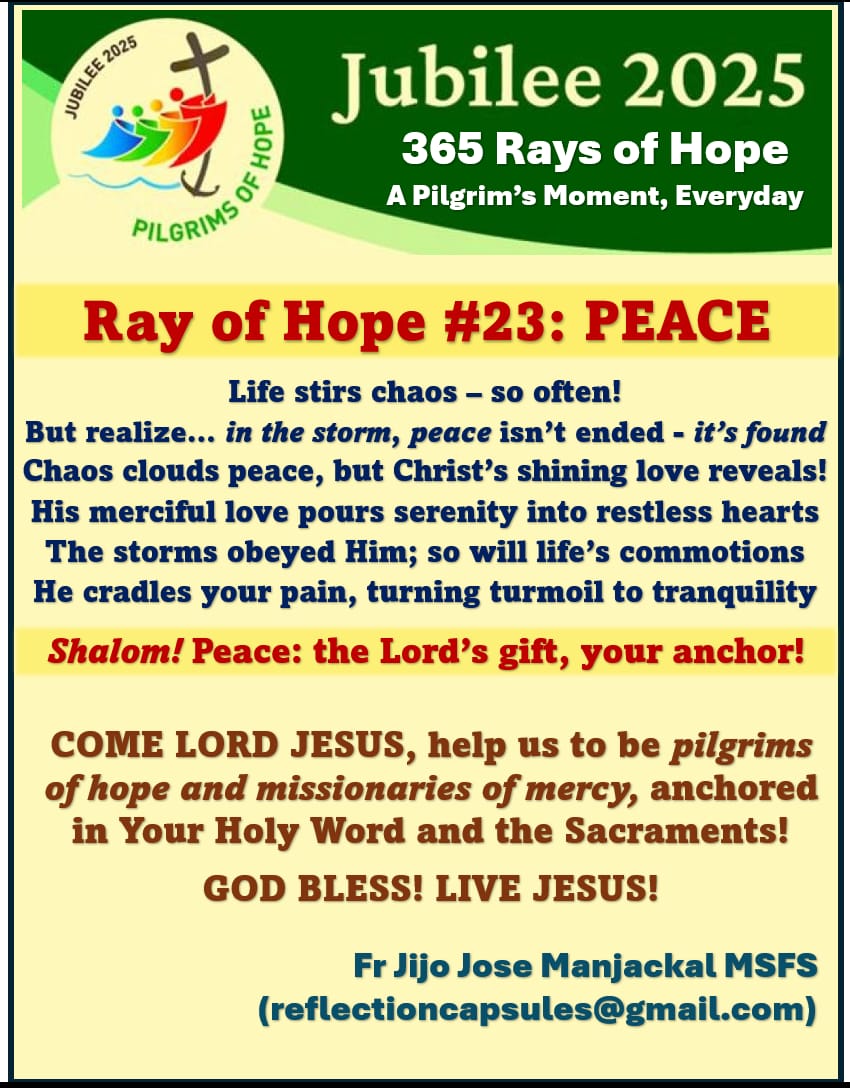 Rays of Hope - Jubilee 2025 stickers Rays of Hope #23 Peace January 16, 2025January 16, 2025 Fr Jijo Manjackal MSFSLeave a comment #23 PeaceDownload Share this: Click to share on X (Opens in new window) X Click to share on Facebook (Opens in new window) Facebook Like Loading...