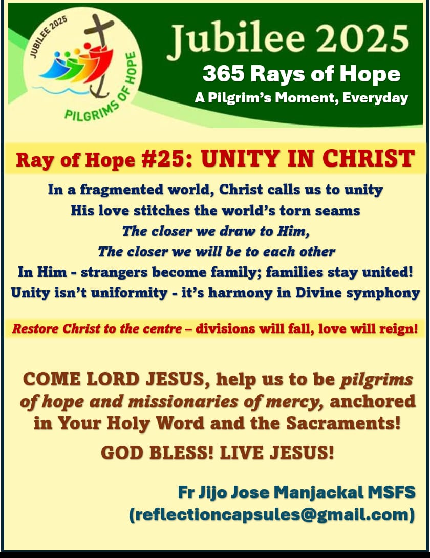 Rays of Hope - Jubilee 2025 stickers Rays of Hope #25 Unity in Christ January 16, 2025 Fr Jijo Manjackal MSFSLeave a comment #25 Unity in ChristDownload Share this: Click to share on X (Opens in new window) X Click to share on Facebook (Opens in new window) Facebook Like Loading...