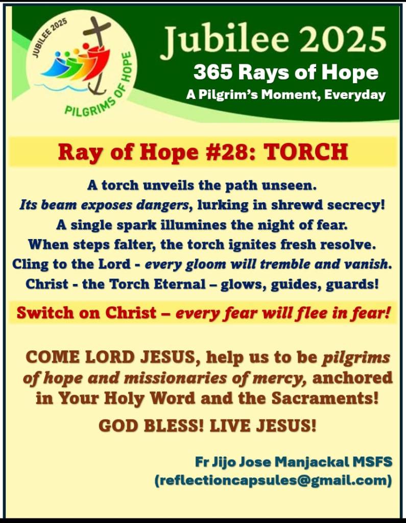 Rays of Hope - Jubilee 2025 stickers Rays of Hope #28 Torch January 20, 2025 Fr Jijo Manjackal MSFSLeave a comment #28 TorchDownload Share this: Click to share on X (Opens in new window) X Click to share on Facebook (Opens in new window) Facebook Like Loading...