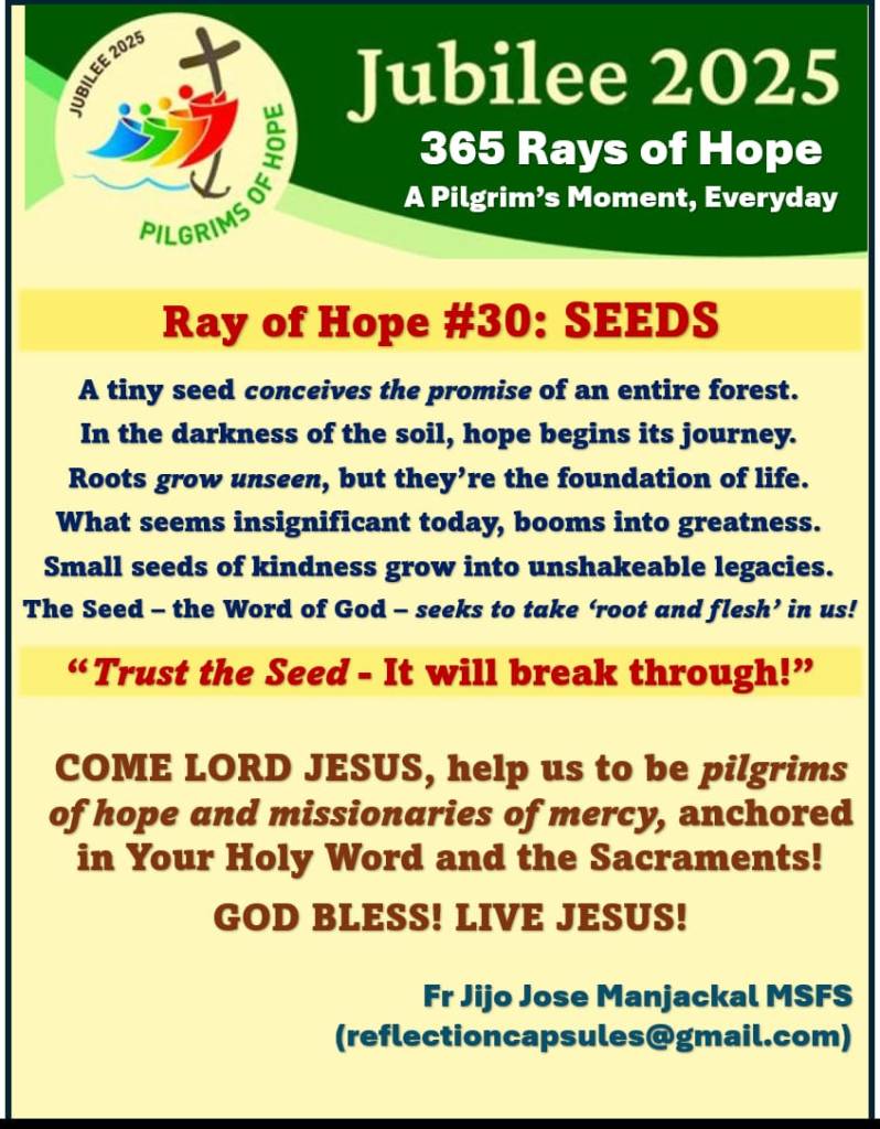 Rays of Hope - Jubilee 2025 stickers Rays of Hope #30 Seeds January 20, 2025 Fr Jijo Manjackal MSFSLeave a comment #30 SeedsDownload Share this: Click to share on X (Opens in new window) X Click to share on Facebook (Opens in new window) Facebook Like Loading...