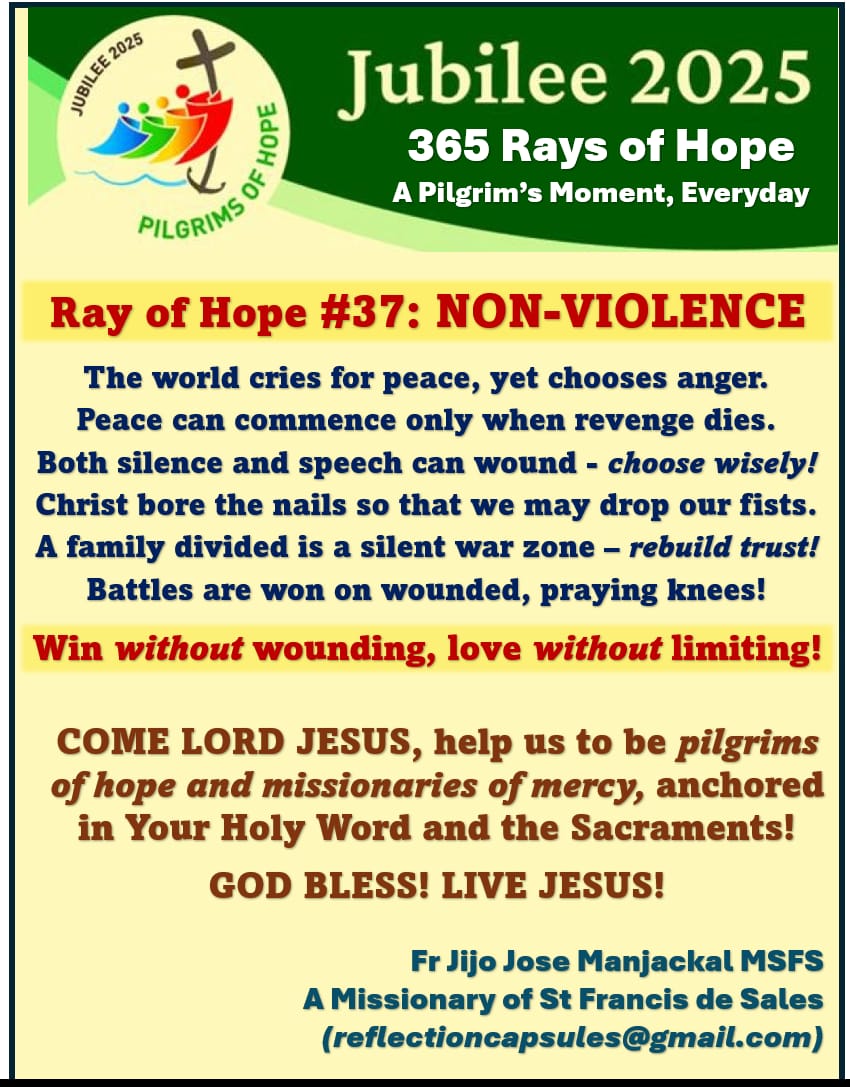 Rays of Hope - Jubilee 2025 stickers Rays of Hope #37 Non Violence February 1, 2025 Fr Jijo Manjackal MSFSLeave a comment #37 Non ViolenceDownload Share this: Click to share on X (Opens in new window) X Click to share on Facebook (Opens in new window) Facebook Like Loading...