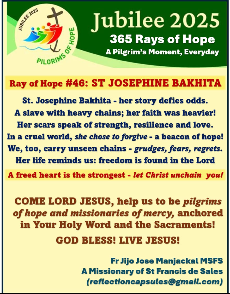 Rays of Hope - Jubilee 2025 stickers Rays of Hope #47 St Josephine Bakhita February 8, 2025 Fr Jijo Manjackal MSFSLeave a comment #46 St Josephine BakhitaDownload Share this: Click to share on X (Opens in new window) X Click to share on Facebook (Opens in new window) Facebook Like Loading...