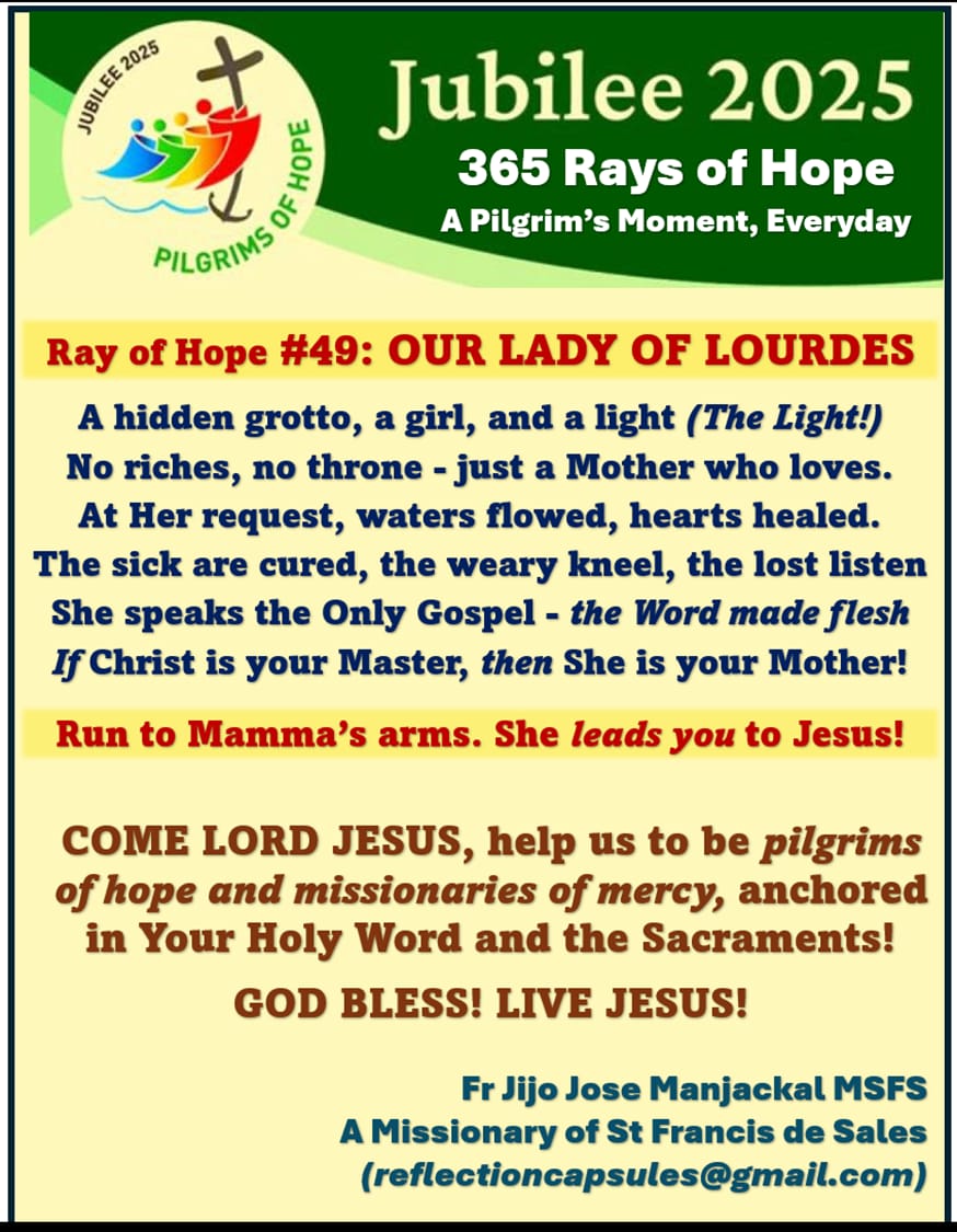 Rays of Hope - Jubilee 2025 stickers Rays of Hope #49 Our Lady of Lourdes February 8, 2025 Fr Jijo Manjackal MSFSLeave a comment #49 Our Lady of LourdesDownload Share this: Click to share on X (Opens in new window) X Click to share on Facebook (Opens in new window) Facebook Like Loading...