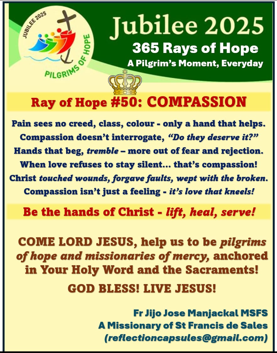 Rays of Hope - Jubilee 2025 stickers Rays of Hope #50 Compassion February 8, 2025 Fr Jijo Manjackal MSFSLeave a comment #50 CompassionDownload Share this: Click to share on X (Opens in new window) X Click to share on Facebook (Opens in new window) Facebook Like Loading...
