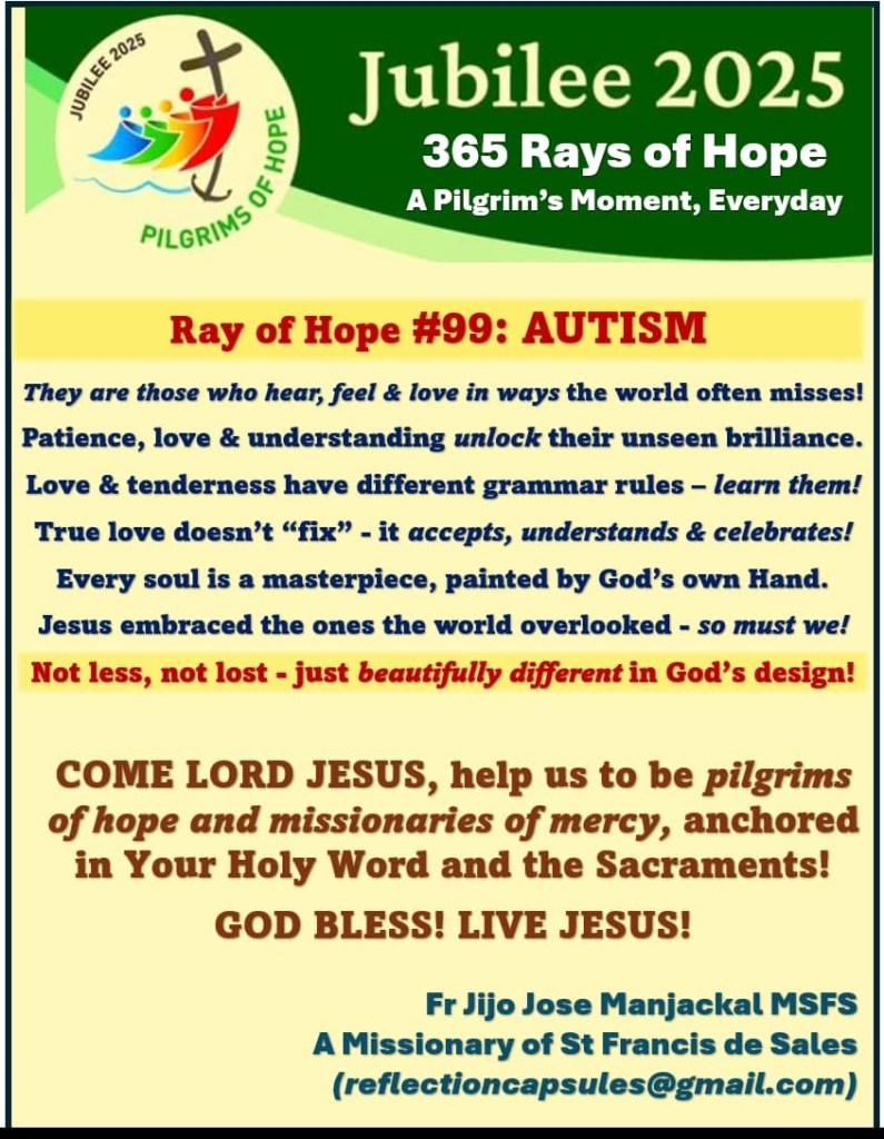 Rays of Hope - Jubilee 2025 stickers Rays of Hope #99 Autism April 2, 2025 Fr Jijo Manjackal MSFSLeave a comment #99 Autism.JPGDownload Share this: Click to share on X (Opens in new window) X Click to share on Facebook (Opens in new window) Facebook Like Loading...