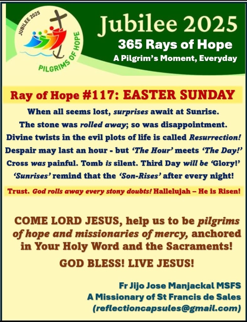 Rays of Hope - Jubilee 2025 stickers Rays of Hope #117 Easter Sunday April 20, 2025 Fr Jijo Manjackal MSFSLeave a comment #117 Easter Sunday.JPGDownload Share this: Click to share on X (Opens in new window) X Click to share on Facebook (Opens in new window) Facebook Like Loading...