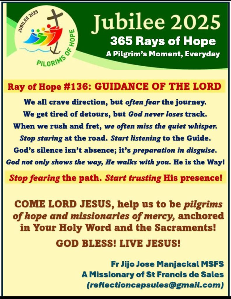 Rays of Hope - Jubilee 2025 stickers Rays of Hope #136 – Guidance of the Lord May 8, 2025May 20, 2025 Fr Jijo Manjackal MSFSLeave a comment Share this: Click to share on X (Opens in new window) X Click to share on Facebook (Opens in new window) Facebook Like Loading...