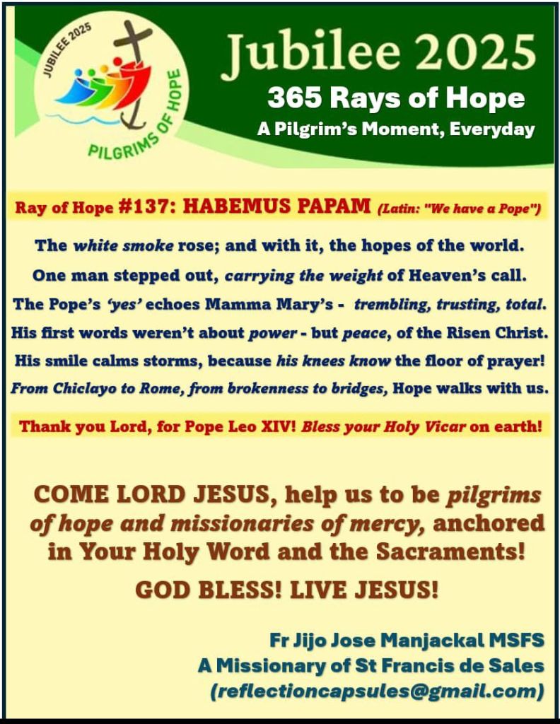 Rays of Hope - Jubilee 2025 stickers Rays of Hope #137 – Habemus Papam May 9, 2025May 20, 2025 Fr Jijo Manjackal MSFSLeave a comment Share this: Click to share on X (Opens in new window) X Click to share on Facebook (Opens in new window) Facebook Like Loading...