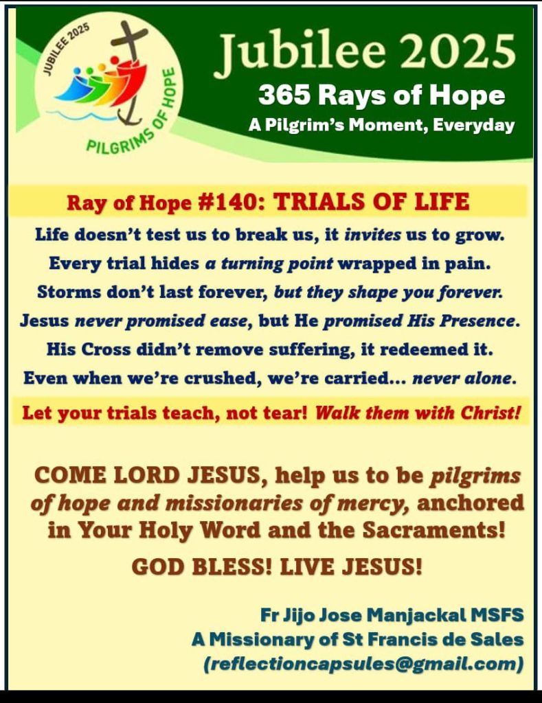 Rays of Hope - Jubilee 2025 stickers Rays of Hope #140 – Trials of Life May 12, 2025May 20, 2025 Fr Jijo Manjackal MSFSLeave a comment Share this: Click to share on X (Opens in new window) X Click to share on Facebook (Opens in new window) Facebook Like Loading...