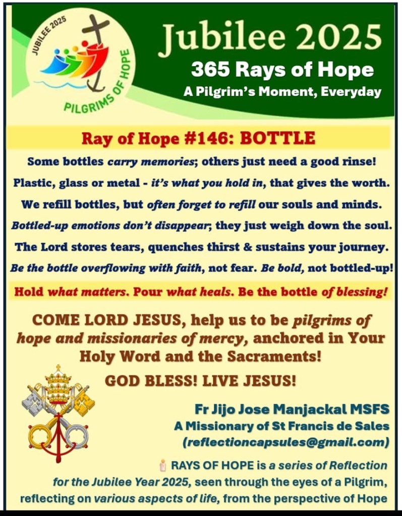 Rays of Hope - Jubilee 2025 stickers Rays of Hope #146 Bottle May 18, 2025 Fr Jijo Manjackal MSFSLeave a comment Share this: Click to share on X (Opens in new window) X Click to share on Facebook (Opens in new window) Facebook Like Loading...