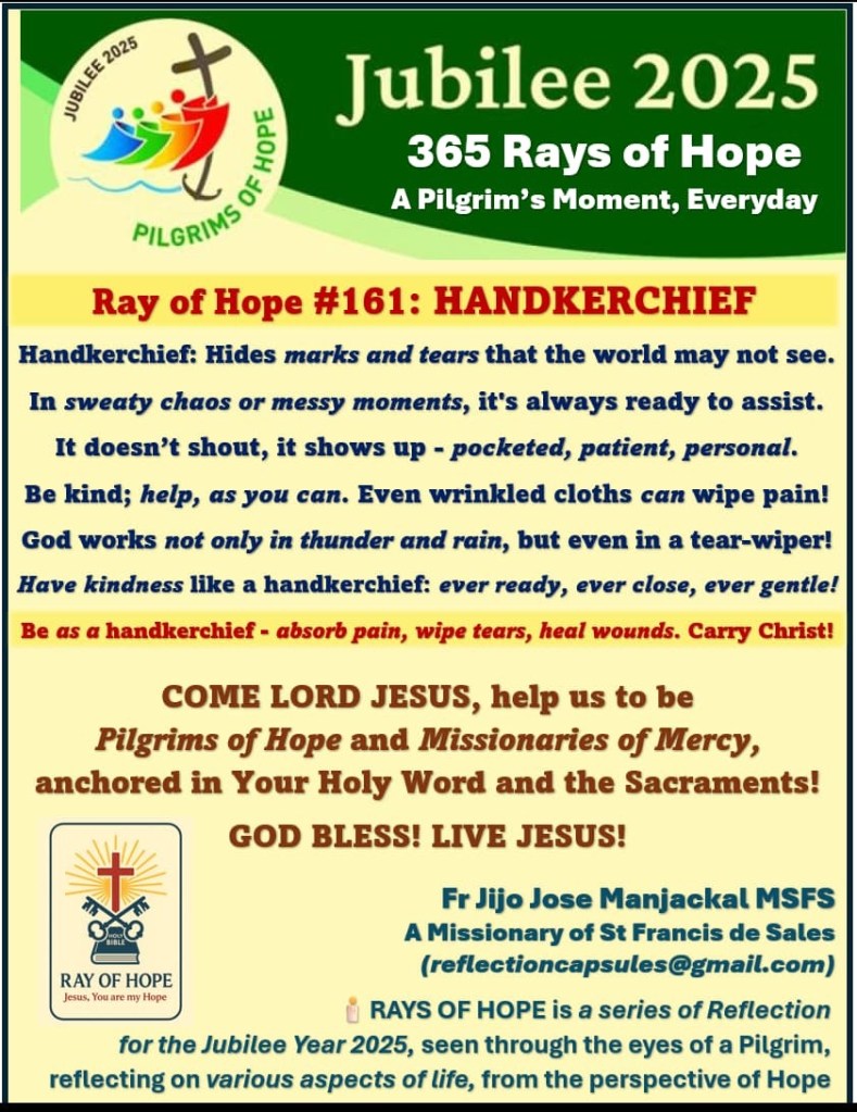 Rays of Hope - Jubilee 2025 stickers Rays of Hope #161 Handkerchief June 2, 2025 Fr Jijo Manjackal MSFSLeave a comment Share this: Click to share on X (Opens in new window) X Click to share on Facebook (Opens in new window) Facebook Like Loading...