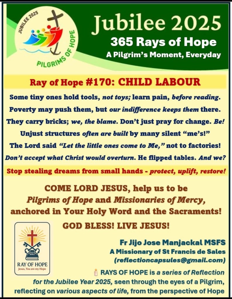 Rays of Hope - Jubilee 2025 stickers Ray of Hope #170: Child labour June 11, 2025 Fr Jijo Manjackal MSFSLeave a comment Share this: Click to share on X (Opens in new window) X Click to share on Facebook (Opens in new window) Facebook Like Loading...
