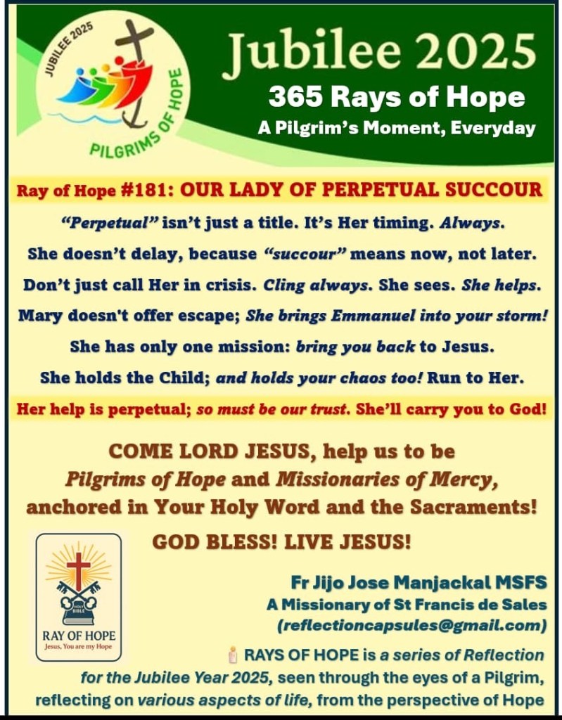 Rays of Hope - Jubilee 2025 stickers Ray of Hope #181: Our Lady of Perpetual Succour June 22, 2025 Fr Jijo Manjackal MSFSLeave a comment Share this: Click to share on X (Opens in new window) X Click to share on Facebook (Opens in new window) Facebook Like Loading...