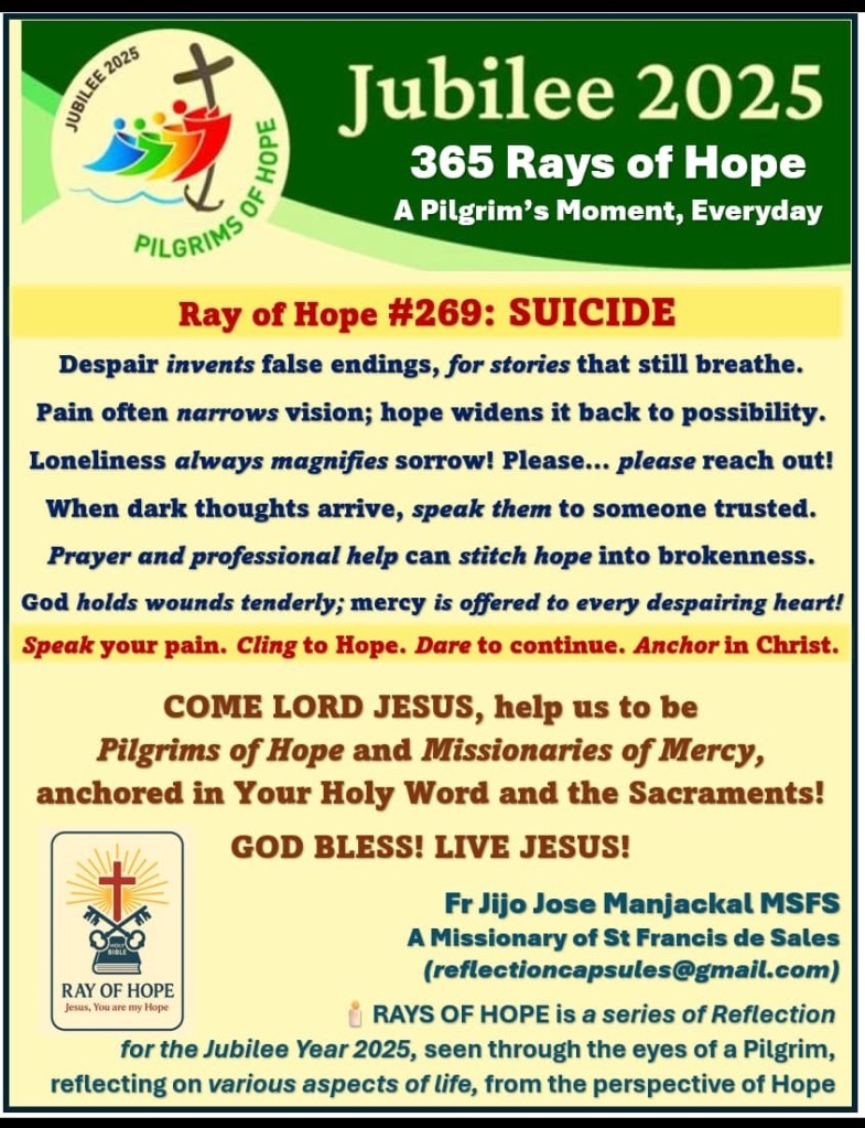 Rays of Hope - Jubilee 2025 stickers Ray of Hope # 269: Suicide September 18, 2025 Fr Jijo Manjackal MSFSLeave a comment Share this: Click to share on X (Opens in new window) X Click to share on Facebook (Opens in new window) Facebook Like Loading...