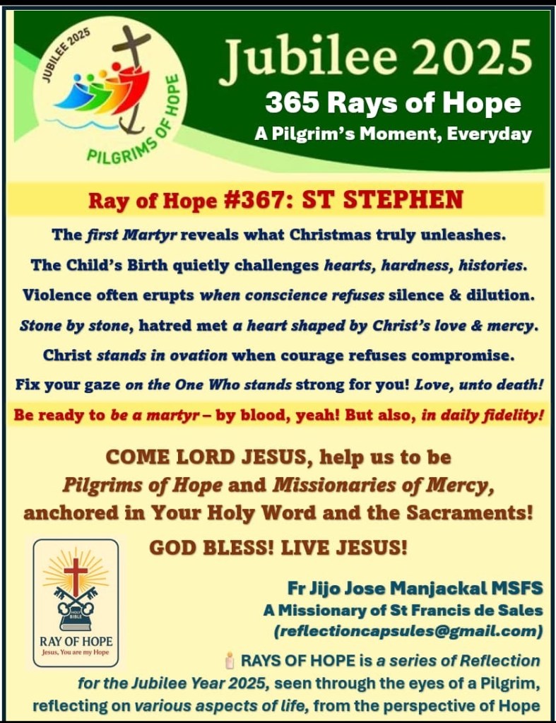 Rays of Hope - Jubilee 2025 stickers Ray of Hope #367: St Stephen December 25, 2025 Fr Jijo Manjackal MSFSLeave a comment Share this: Click to share on X (Opens in new window) X Click to share on Facebook (Opens in new window) Facebook Like Loading...