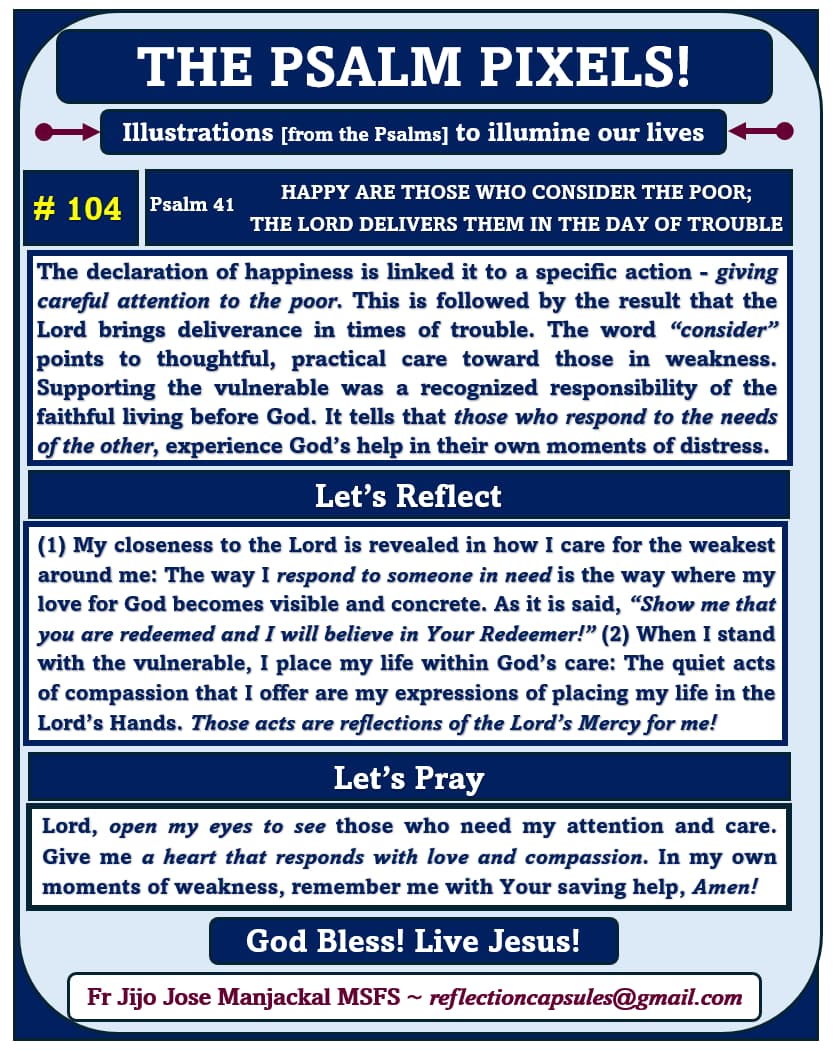 The Psalm Pixels The Psalm Pixels #104 April 26, 2026 Fr Jijo Manjackal MSFSLeave a comment Share this: Share on X (Opens in new window) X Share on Facebook (Opens in new window) Facebook Like Loading...